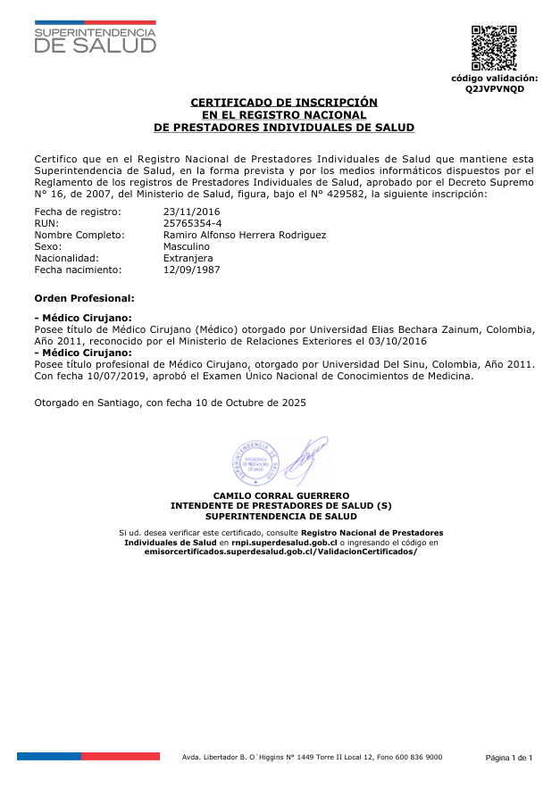 Soy el Dr. Ramiro Alfonso Herrera Rodríguez, Médico Cirujano con más de 12 años de experiencia en Colombia, Argentina y Chile. Me formé en la Universidad del Sinú (Colombia) y desde 2016 ejerzo en Chile, donde aprobé el Examen Único Nacional de Conocimientos de Medicina.